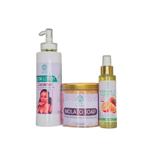 Discover healthier skin with the Caramel Set By Glow Empire. This all-in-one set contains Molato Soap, Vitamin C Glow Oil, and Glow Caramel Lotion, giving you the nourishment and glow you need. Natural ingredients help prevent skin damage and improve complexion, for soft and smooth skin.